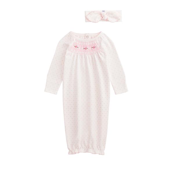 The gown features dainty chest smocking with tiny embroidered rosebuds and soft ivory dot detailing that adds a timeless, heirloom feel. A ruffle hem gives it that extra touch of sweetness, while the elasticized bottom makes diaper changes a breeze. The coordinating bow headband completes the outfit, making this set perfect for newborn photos, baby showers, or bringing baby home in picture-perfect style.