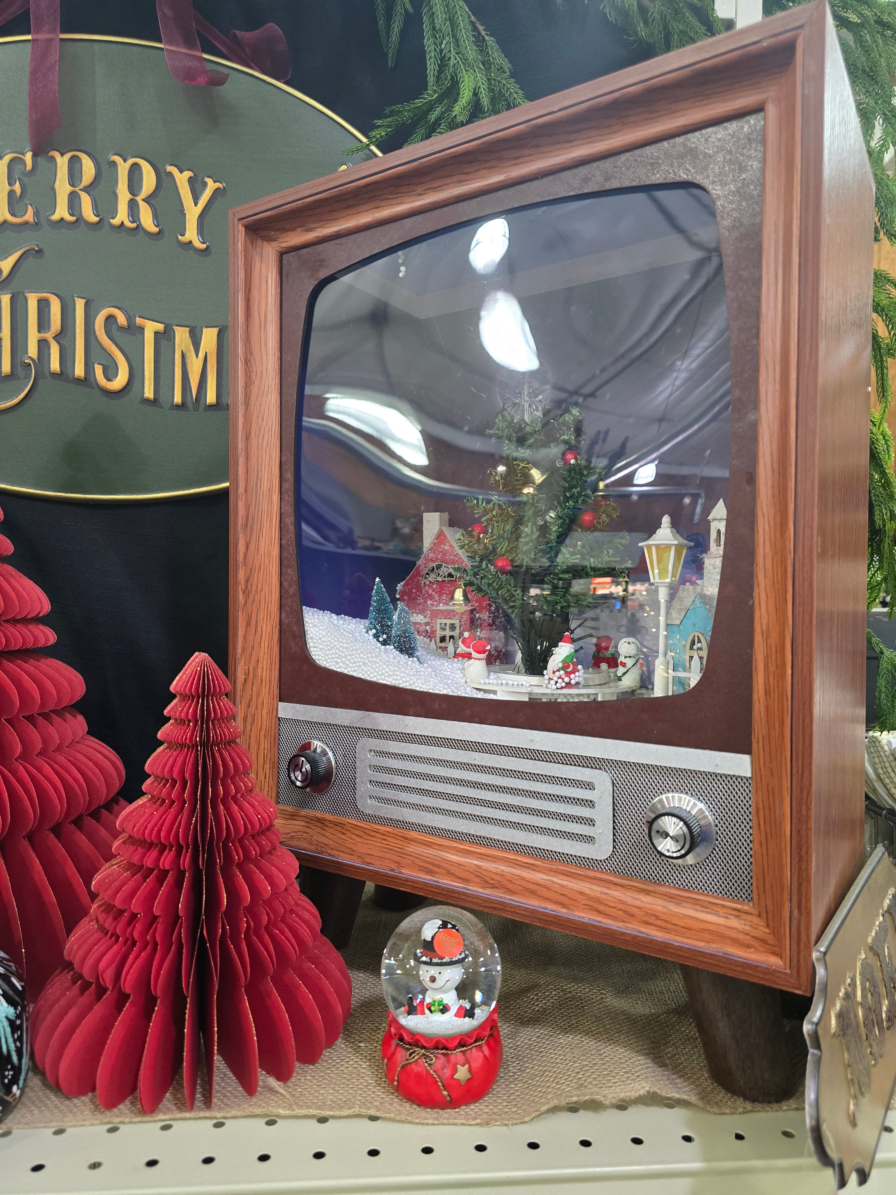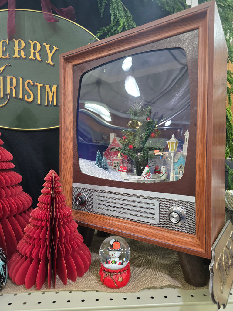 Bring a touch of nostalgia to your holiday décor with the Glory Haus Large Retro TV with Christmas Scene. This charming lighted piece captures the magic of Christmas past — a glowing tree, snow-covered houses, and twinkling lights — all displayed inside a vintage-style wooden TV frame.