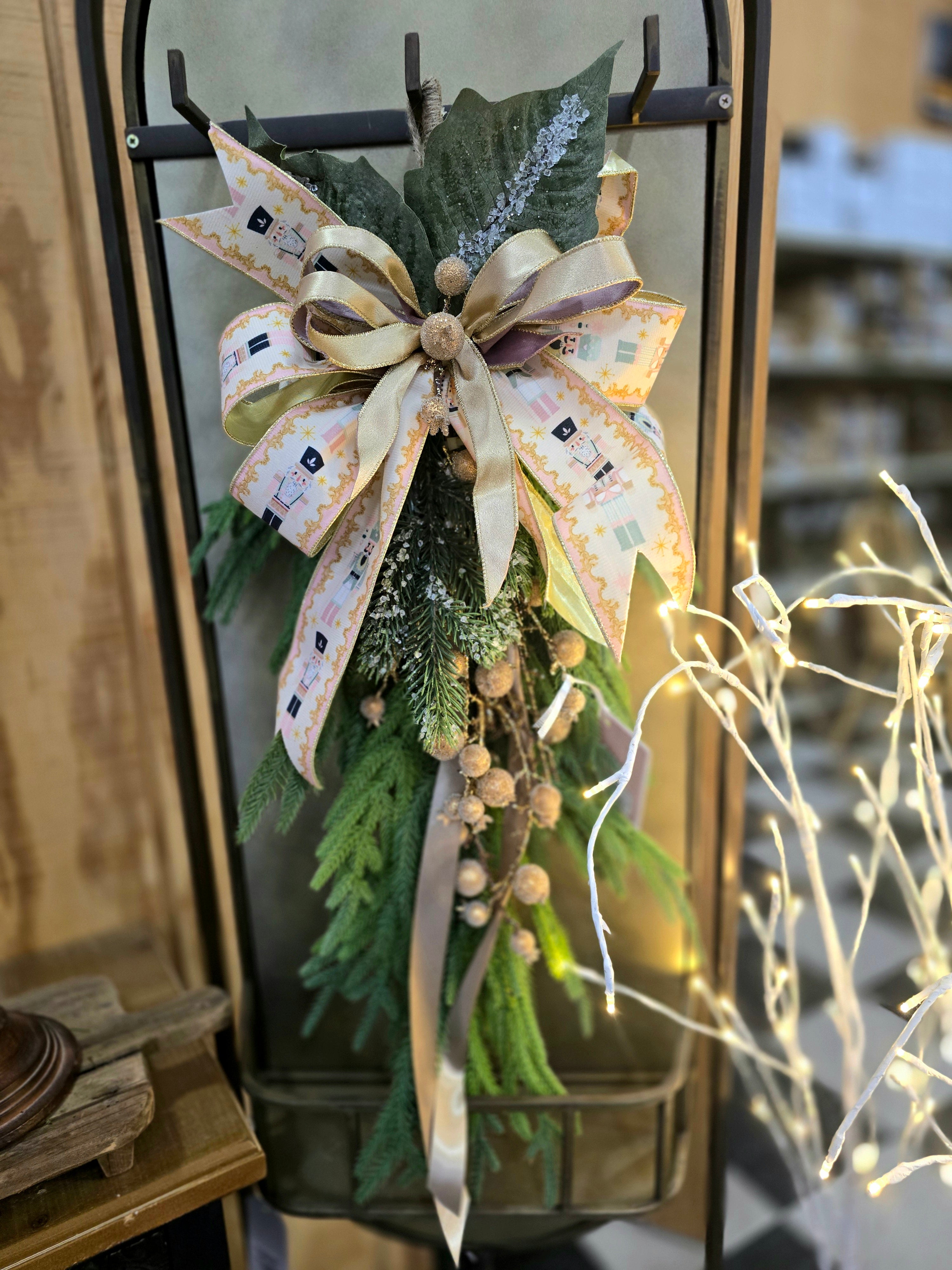 Step into the magic of the season with the Nutcracker Lane Christmas Swag, a charming handcrafted design full of soft holiday elegance. This 30-inch beauty features layered evergreens, frosted accents, champagne-gold shimmer, and a hand-tied multi-ribbon bow inspired by classic nutcracker motifs.