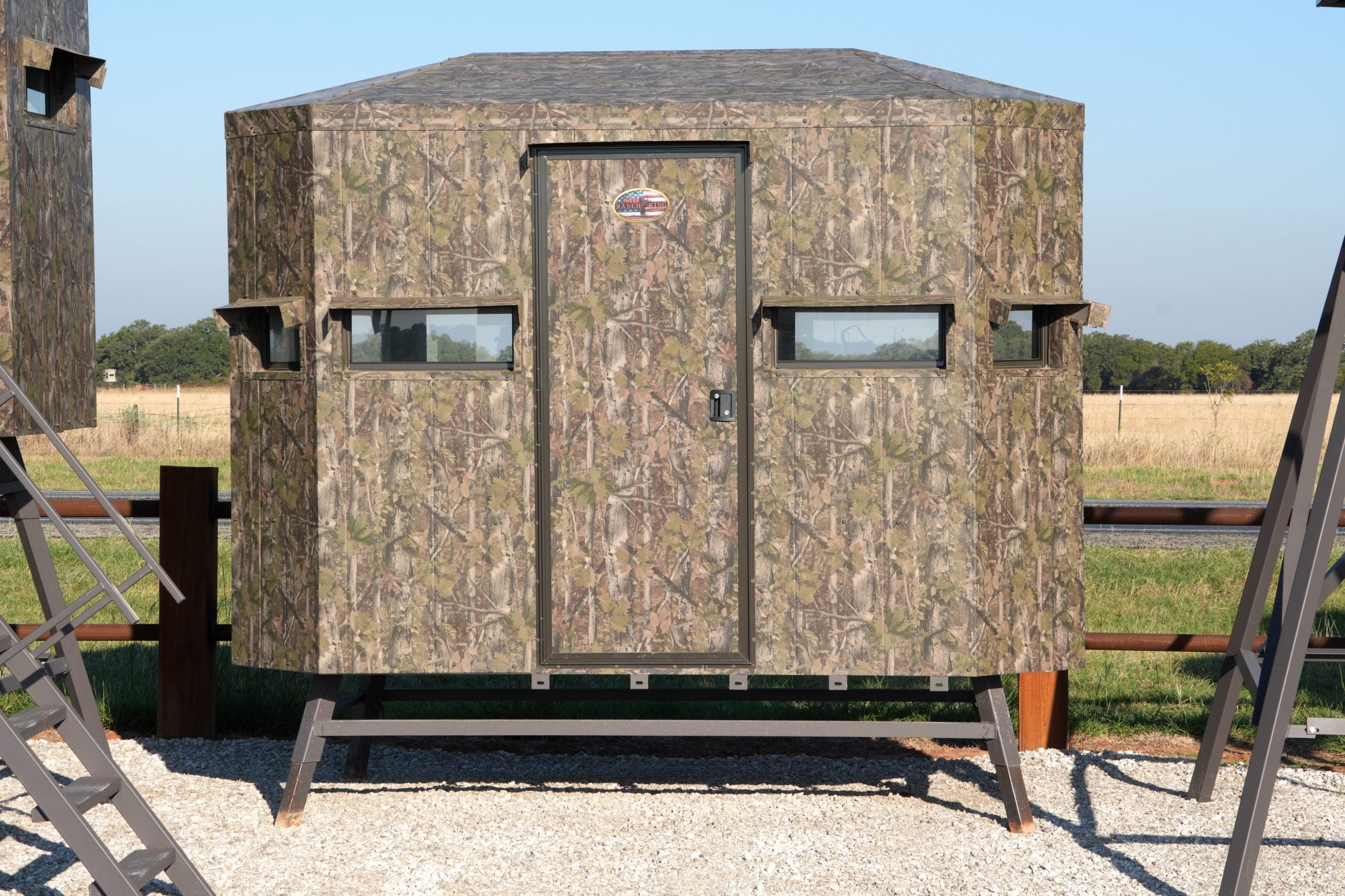 Tower heights range from 5, 10, to 15 feet, or you may opt for a ground-level setup. Enhance your insulated deer blind with optional window gun rest pads and curtains for comfort. Available for delivery and setup, these made-in-the-USA structures are spacious enough to accommodate family and friends for a shared hunting adventure.