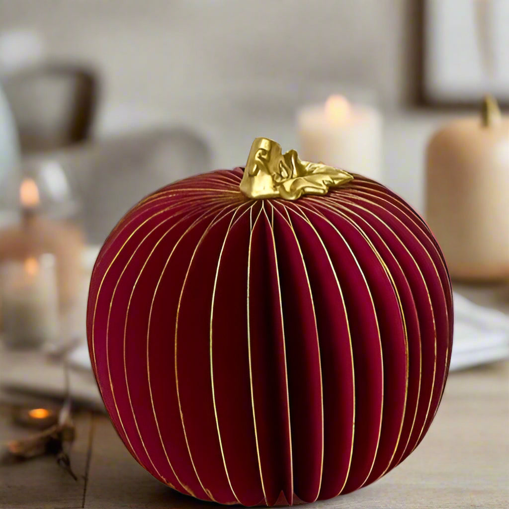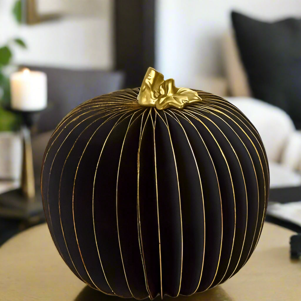 Go big with your fall style! Our Two’s Company Large Round Accordion Pumpkins make a stunning seasonal statement with their bold shape and rich hand-painted finish. Designed in 3 gorgeous autumn shades and topped with shimmering gold stems, these oversized round pumpkins bring a perfect mix of festive charm and modern elegance. Use one as a standout centerpiece or group them with other sizes for a layered, designer look that transforms your home for the season.