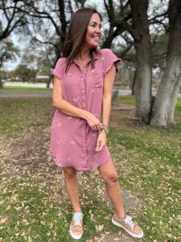 Designed with a frayed hem at the bottom and sleeves, this dress exudes a laid-back sophistication, perfect for both everyday wear and special occasions. The classic button-down front adds versatility—wear it as a dress or layer it open over a tank and denim for a stylish, effortless look.