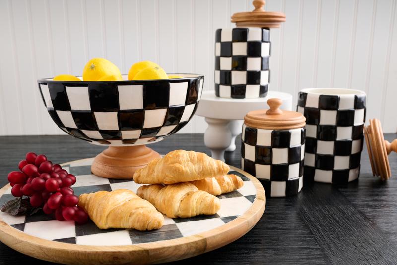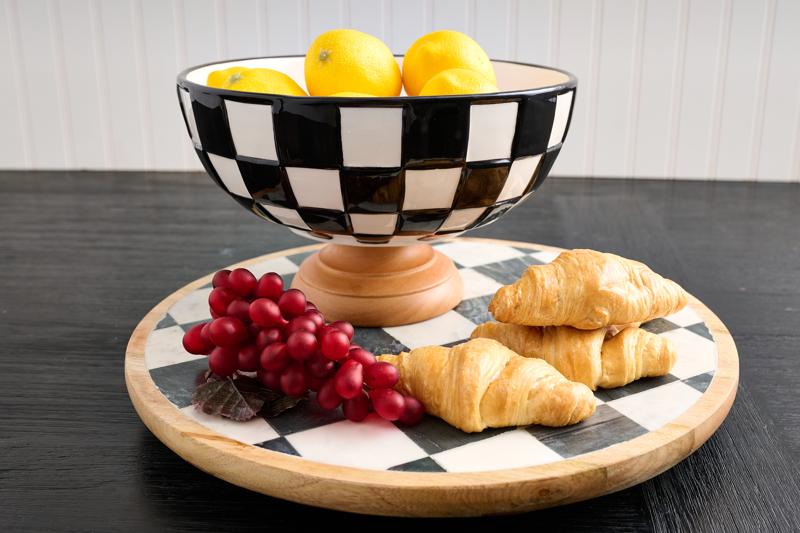 Add a bold, elegant touch to your table or countertop with the Mud Pie Checkered Pedestal Bowl. Hand-painted in a timeless black-and-white checkered pattern, this ceramic beauty combines style and function effortlessly. The footed mango wood base adds warmth and contrast, making it a true statement piece. Perfect for serving fruit, displaying decor, or simply adding character to your home — this bowl will steal the show wherever it’s placed. See other Bistro Pieces here