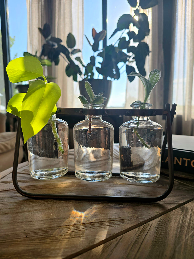 Bring a little everyday elegance to your home with our Flower Arranger Glass Bottle Vases. This charming set pairs three glass bottle vases with a sleek metal stand, giving you the perfect blend of rustic charm and modern sophistication.