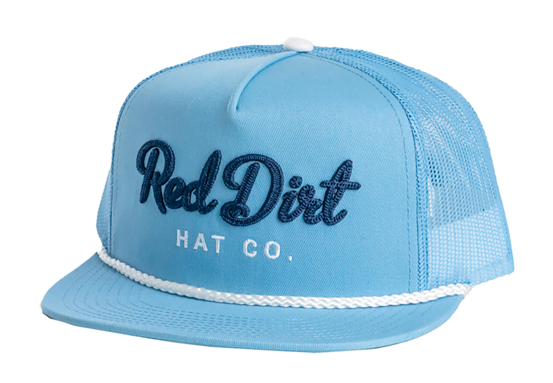 Bold Red Dirt embroidered script on light blue front