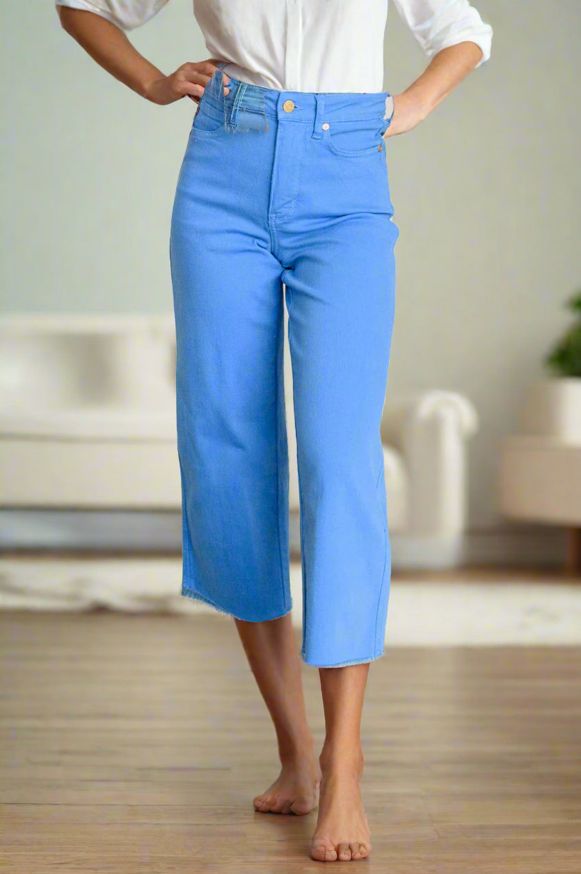 Say hello to your new sunny-day go-to! These Skyblue High Waist Wide Crop Pants by Judy Blue bring the feel-good vibes with a fresh pop of color and all the flattering features you love. The high-rise fit smooths and supports thanks to the built-in tummy control panel (yes, please), while the wide leg and cropped length keep things breezy and laid-back.