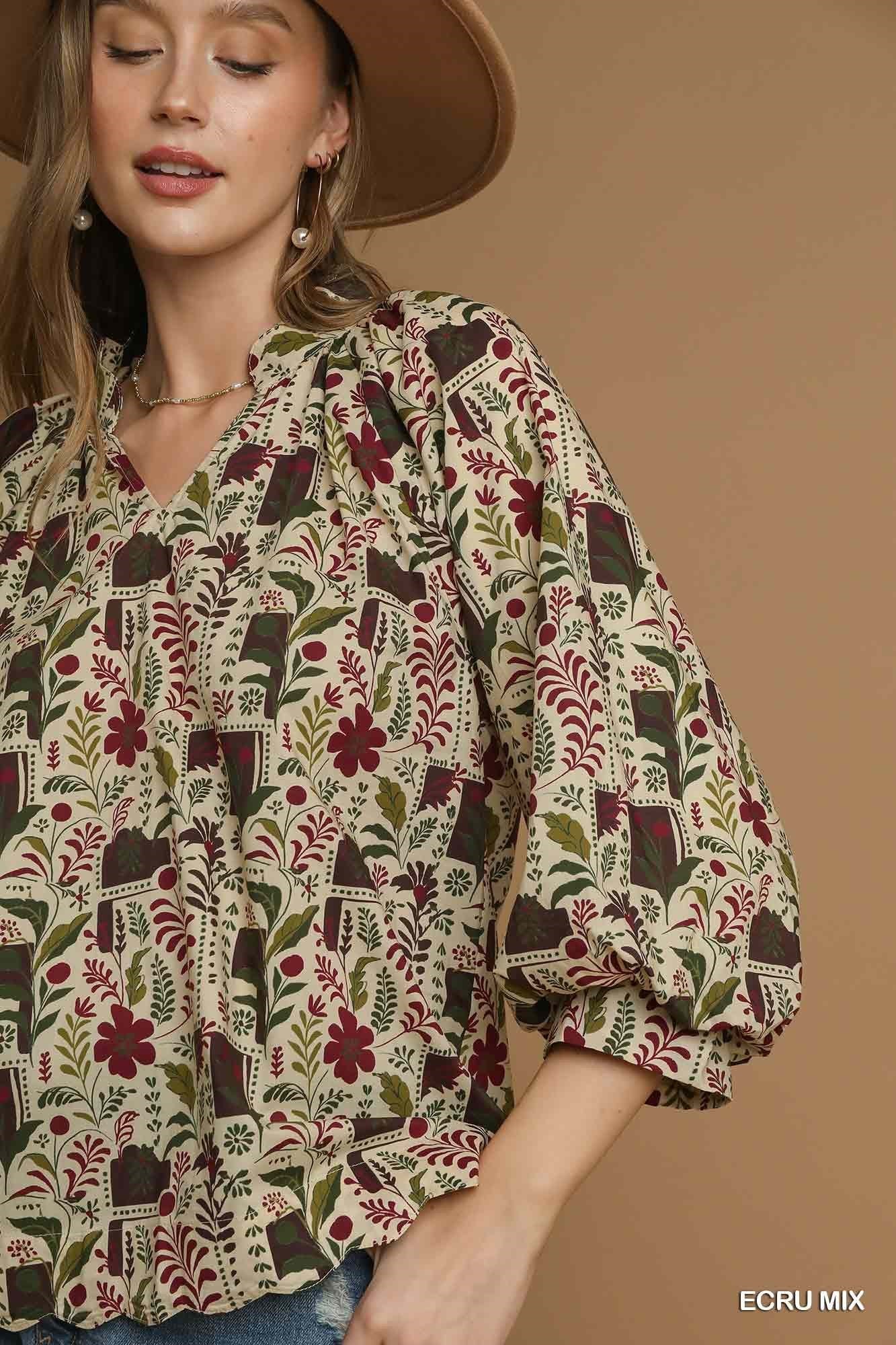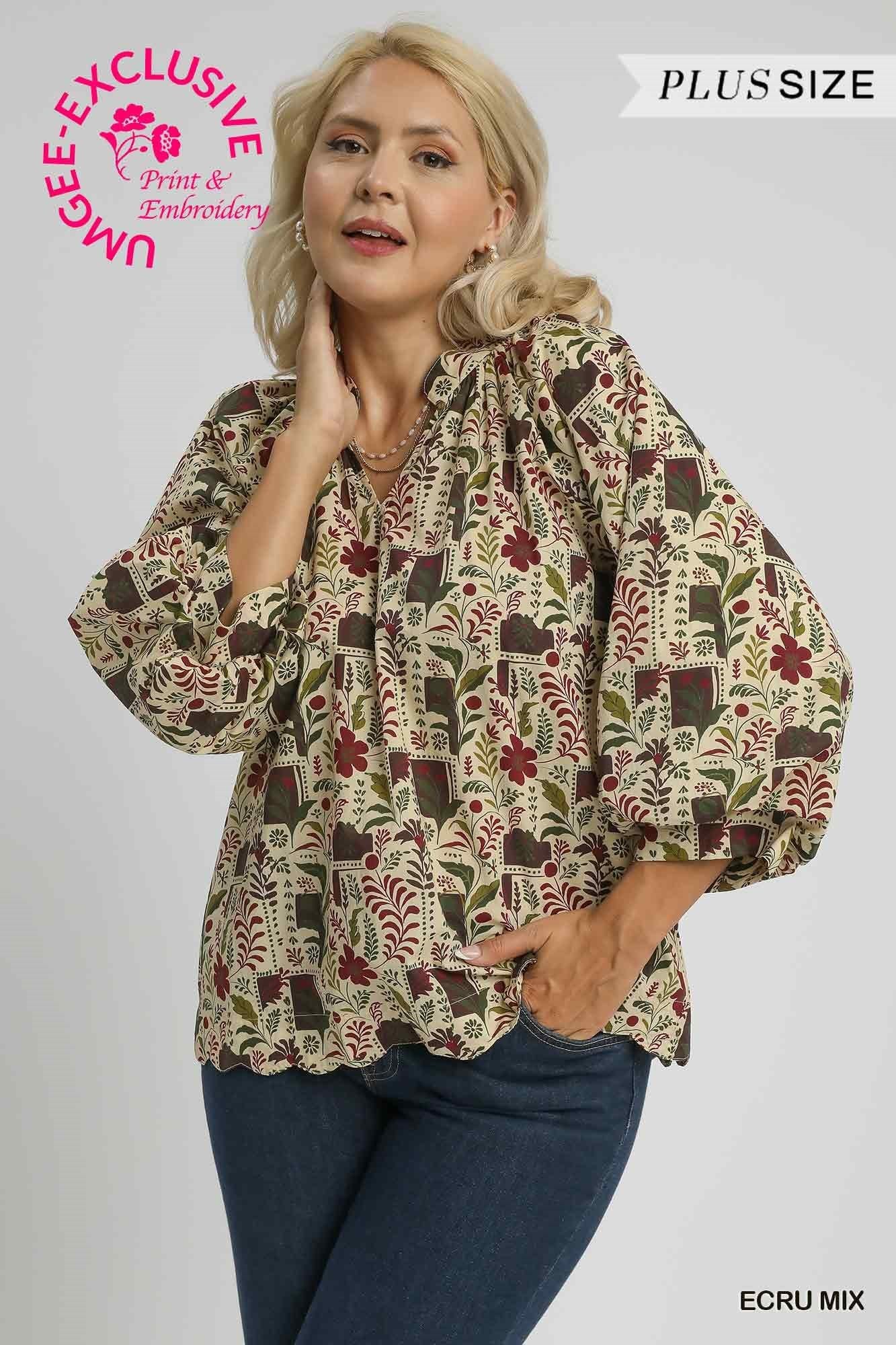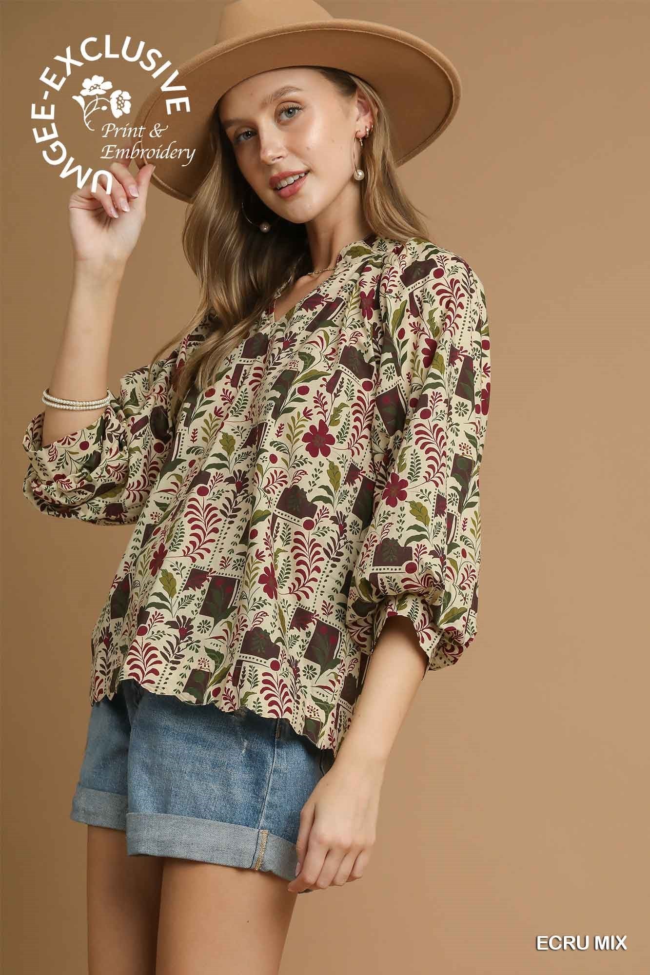 Fresh, feminine, and effortlessly versatile, our Floral Print Scallop Hem Blouse is a wardrobe essential for any season. Made from 100% cotton, this lightweight blouse features a flattering V-neckline framed by a ruffle collar for a touch of charm. The 3/4 puff sleeves add a romantic feel, while the scallop hemline gives it a delicate, finished look. Perfect for pairing with denim, shorts, or skirts for easy everyday style.