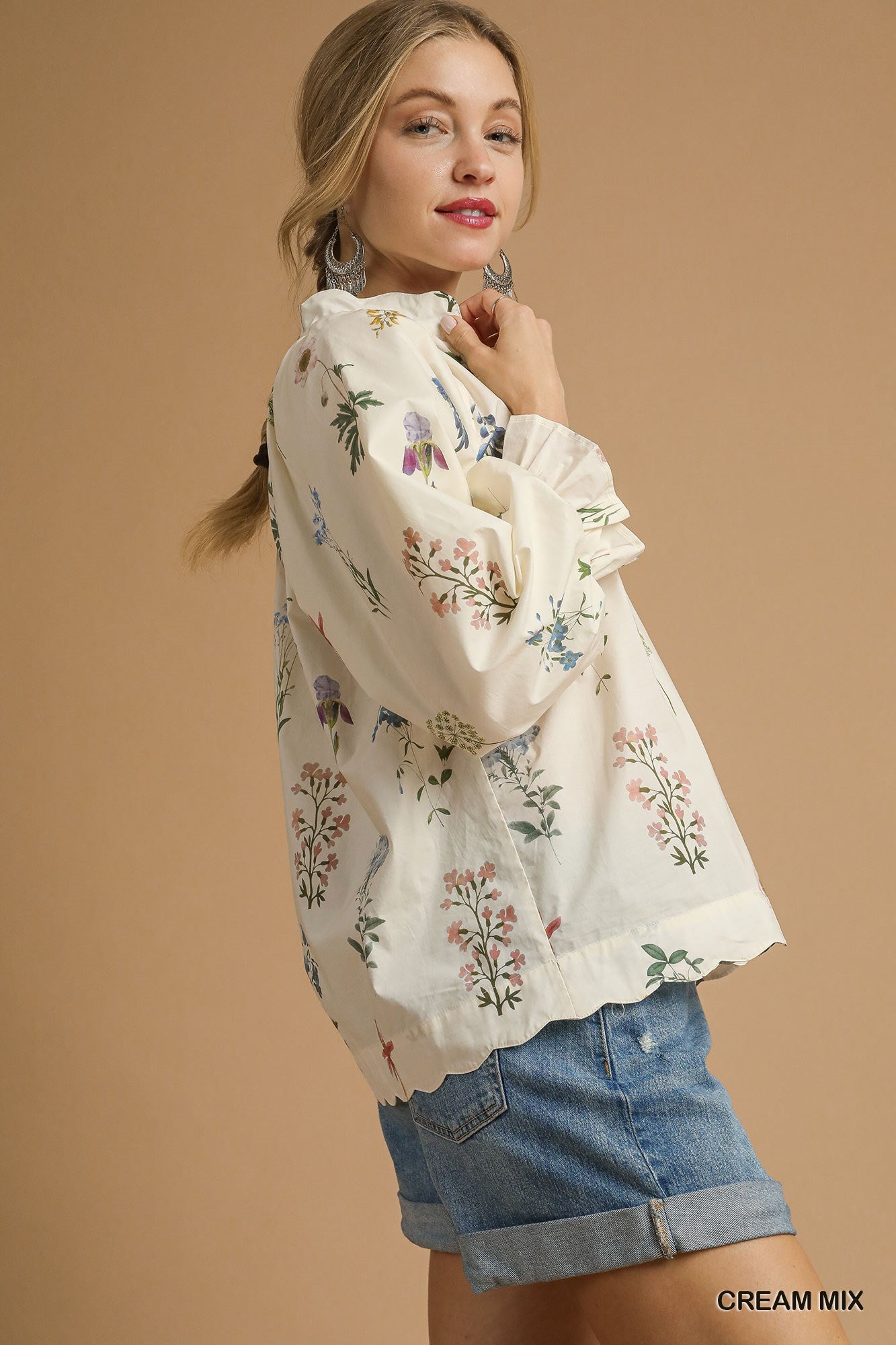 Your everyday style just got a little upgrade with this Floral Ruffle Neck Blouse. Featuring a botanical garden floral design, it’s equal parts feminine and polished. The ruffle mock neck with a subtle front slit adds just the right amount of detail, while the long balloon sleeves with ruffled cuffs bring a flowy, romantic touch. Finished with a scalloped hem, this blouse is as versatile as it is beautiful—pair it with denim for brunch or tuck it into trousers for a dressier vibe.
