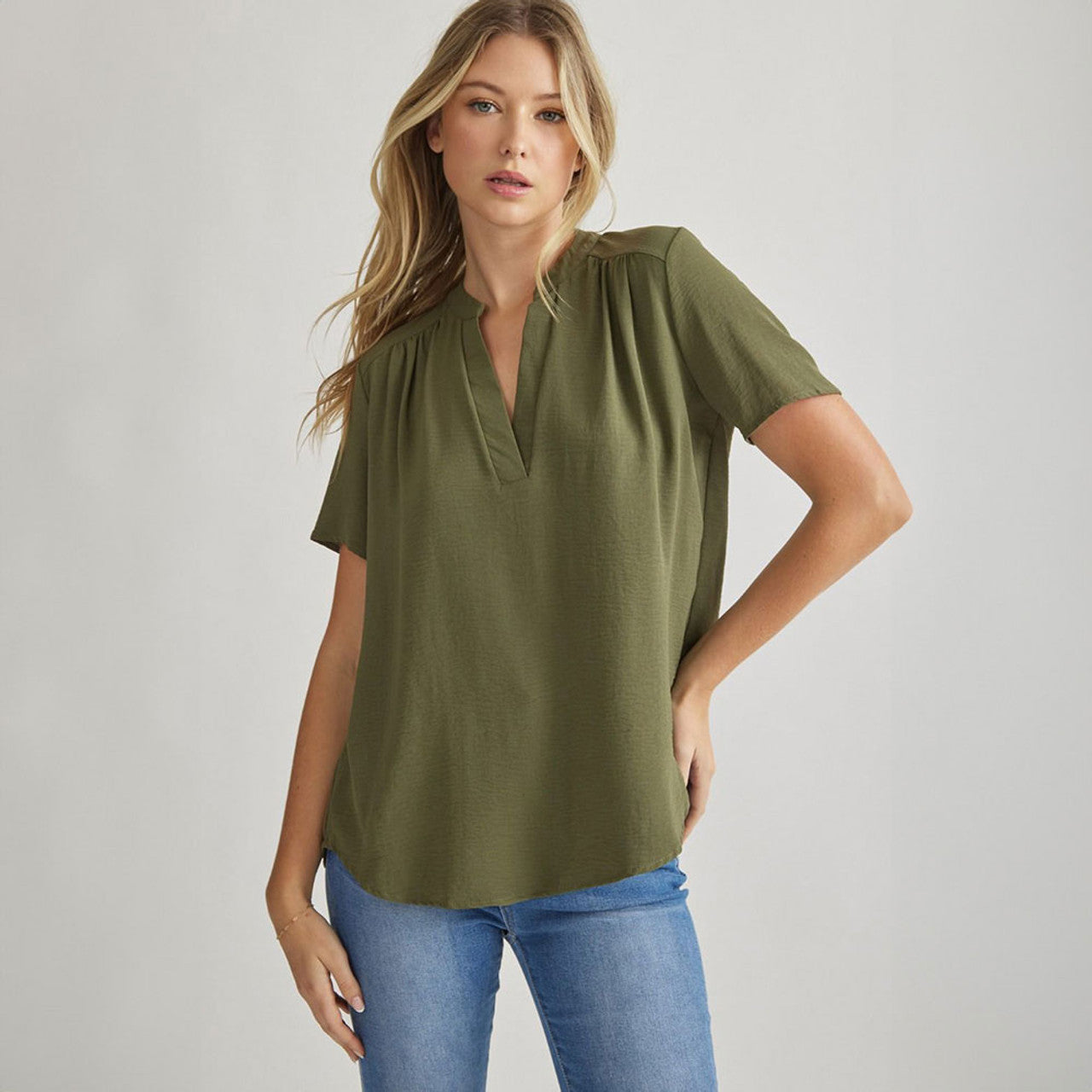The Olive V-Neck Placket Top is that “any day, every day” kind of blouse — effortlessly polished, endlessly comfortable, and made to go with everything.