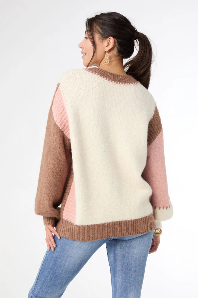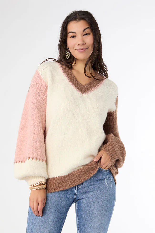 This soft, color-blocked knit features warm neutral tones with a touch of blush โ the perfect blend of sweet and sophisticated. The relaxed fit, flattering V-neckline, and balloon sleeves give it that effortless โthrow-on-and-look-cuteโ vibe we all love.ย