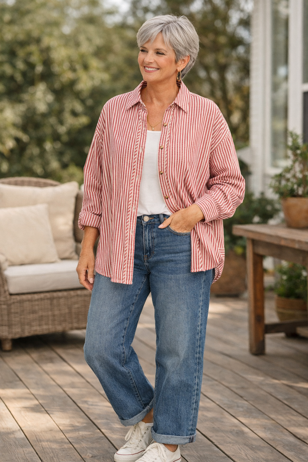 This is one of those easy, grab-and-go pieces that instantly makes an outfit feel styled without trying too hard. Our Oversized Striped Button Down Shirt is made from 100% cotton, giving it that breathable, lived-in feel we all love—especially for warm days and layering seasons.