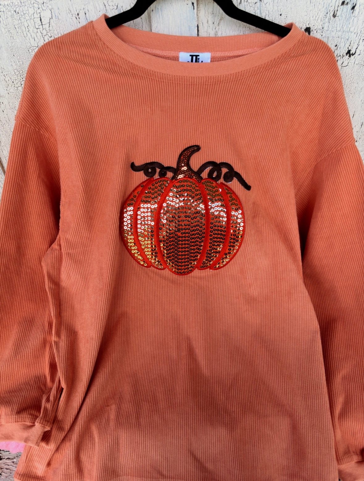 Meet your new favorite fall layer: the Sequin Pumpkin Corded Crew in Orange. Ultra-soft and effortlessly cozy, this sweatshirt was made for crisp autumn mornings, cozy evenings by the fire, and pumpkin patch adventures. The relaxed fit and leggings-friendly length make it an easy throw-on piece you’ll reach for again and again. And that sparkling sequin pumpkin? It’s just the right amount of festive without going over the top.