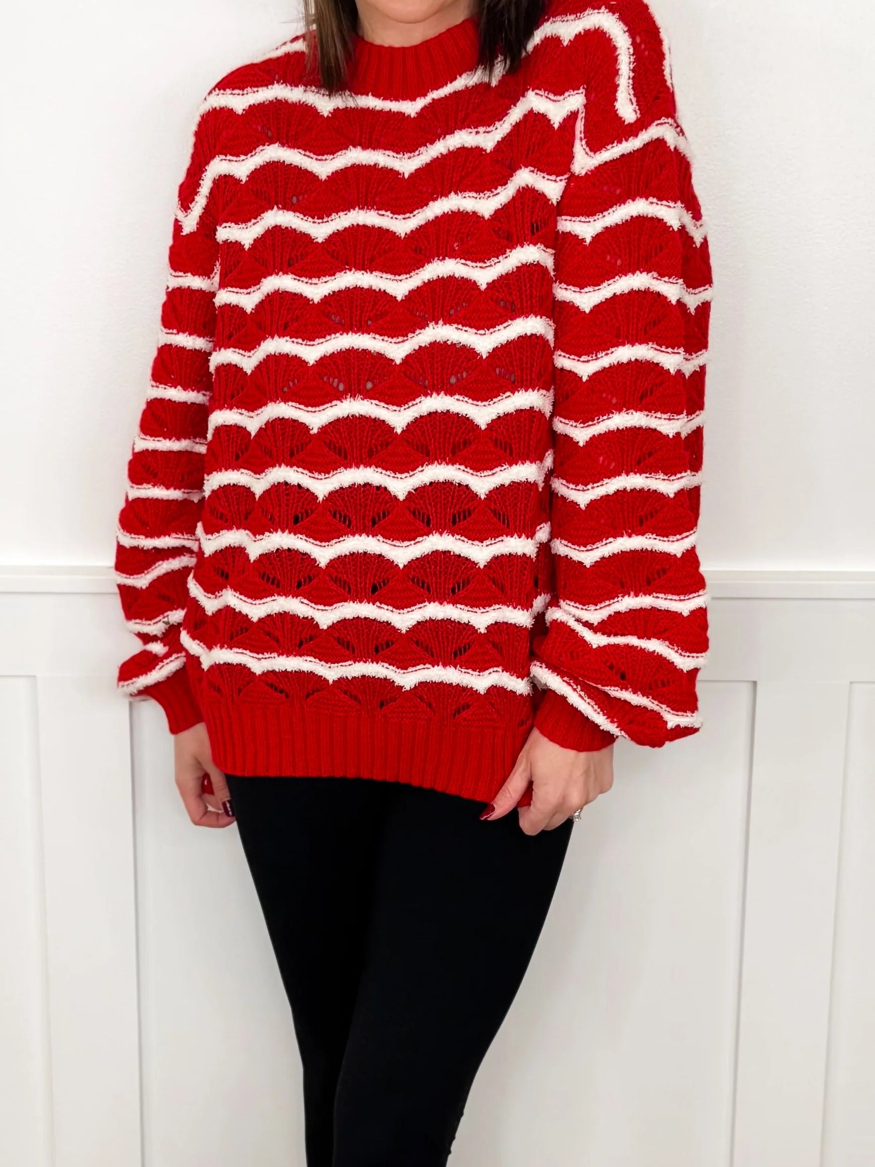 Pair it with denim, leggings, boots, or even a skirt for holiday photos. This is the kind of sweater that makes you feel festive the moment you slip it on — stylish, soft, merry, and bright!