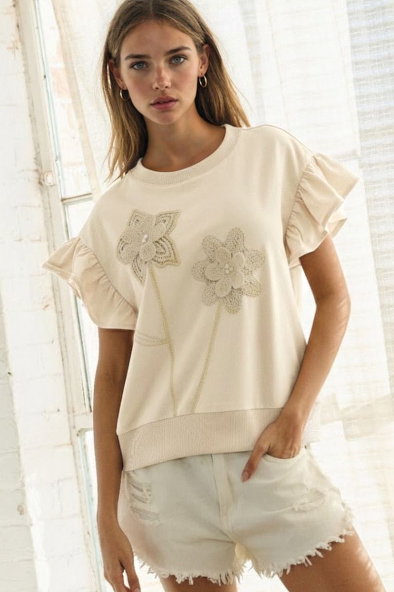 With delicate dimensional floral details and sweet ruffle sleeves, this piece feels a little dressed up while still being as comfortable as your favorite sweatshirt. The lightweight fabric makes it perfect for spring days when you want something easy—but still pulled together.