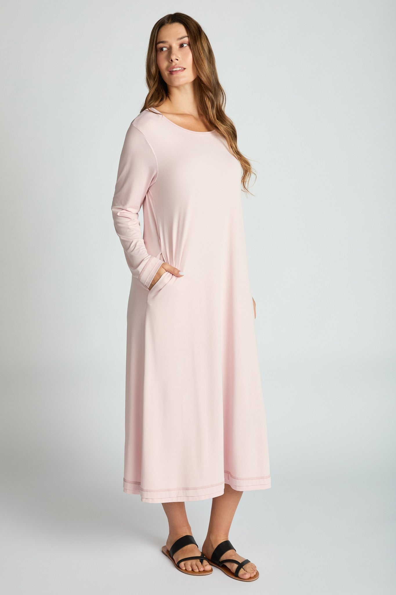 This is one of those throw-it-on-and-go dresses that still feels pulled together. Lightweight, breathable, and made with a high-stretch jersey, this midi moves with you and never feels restrictive. The double-layer trim adds a little structure, while the pockets seal the deal (because yes…real pockets).